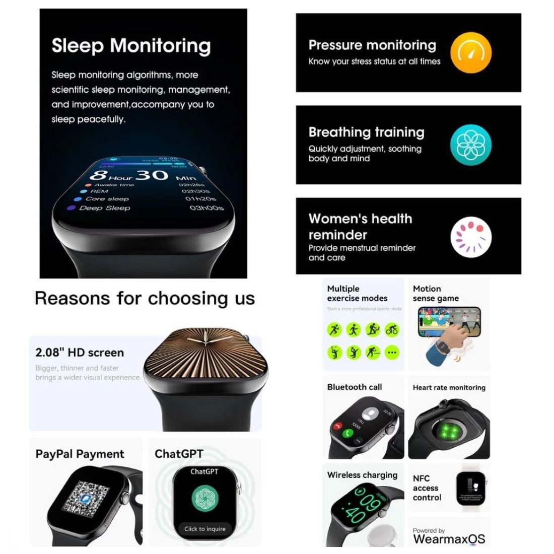 Más de 500 descargas sin marcación, control de acceso NFC, grabador de audio, álbum de fotos, tono de llamada independiente, Chat GPT, brújula, traducción de lenguaje, Isla Lingmove, llamadas SOS, añadir libros electrónicos, pulsación de mapa inferior del menú principal, añadir códigos de pagos Paypal, Alipay, QQ, Weixin Pay, información push, comandos de voz compatibles con Alexa, Siri y Google, isla dinámica, modo no molestar, posicionamiento para ver exactamente dónde nos encontramos, álbum de fotos (puedes importar fotos en tu smartwatch),